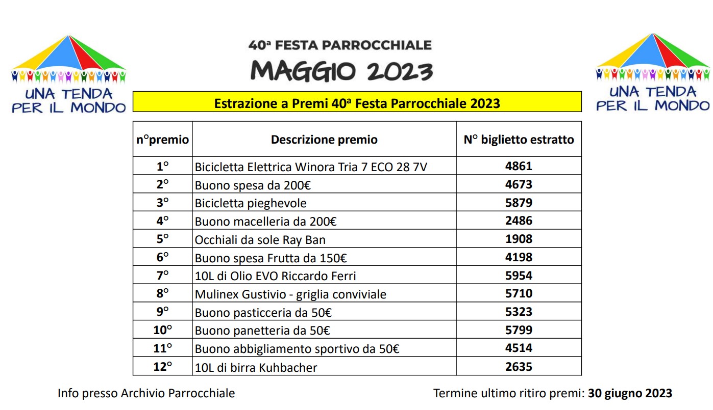 Festa parrocchiale 2023 – elenco biglietti estratti Pubblicato giorno 29 maggio 2023 - Senza categoria