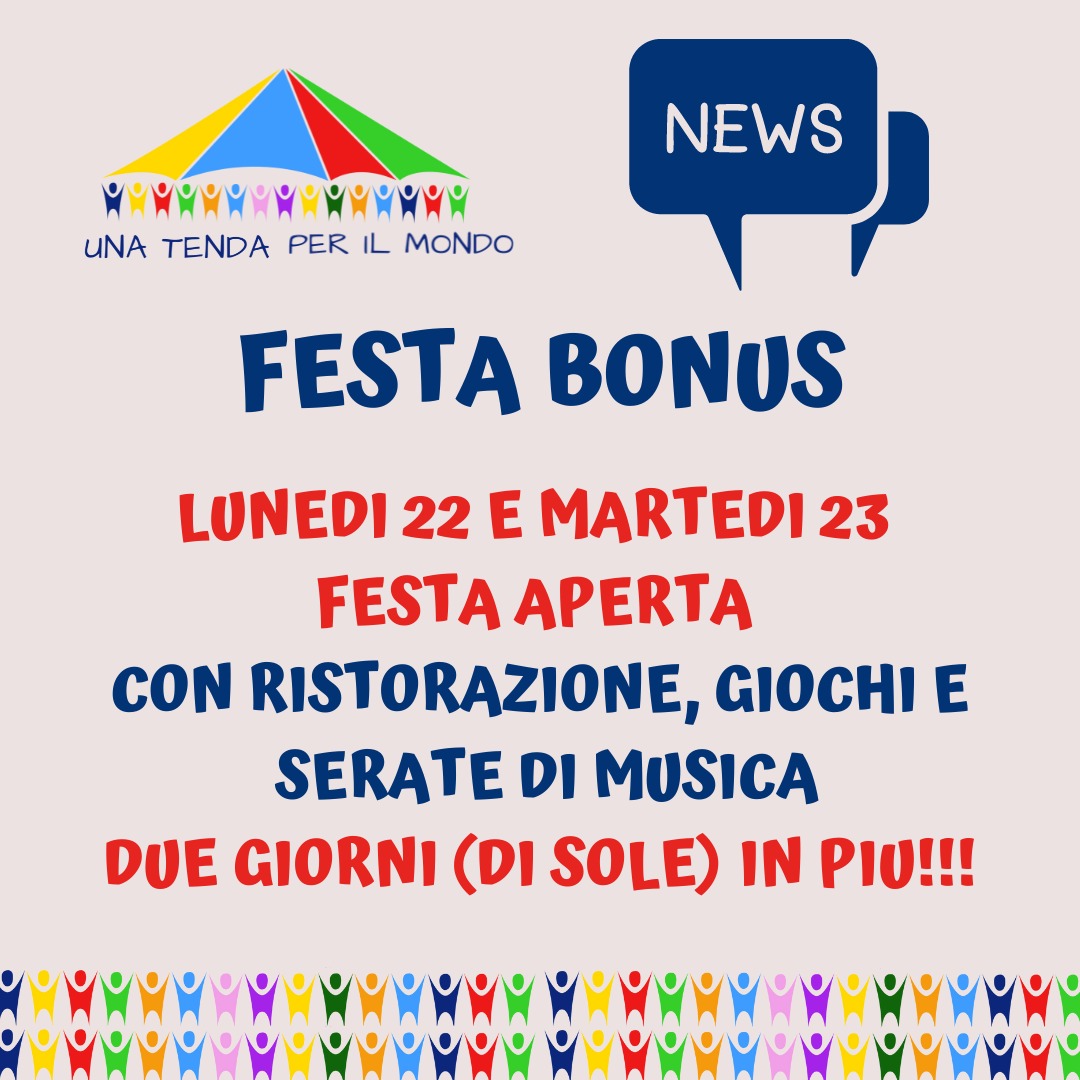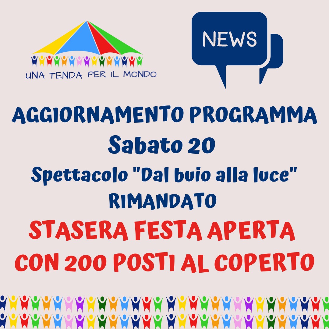 Si segnala, con l’occasione, che lo spettacolo previsto per sabato 20 maggio “Dal buio alla luce” è stato rimandato. La serata prevede comunque la ristorazione con 200 posti al coperto.