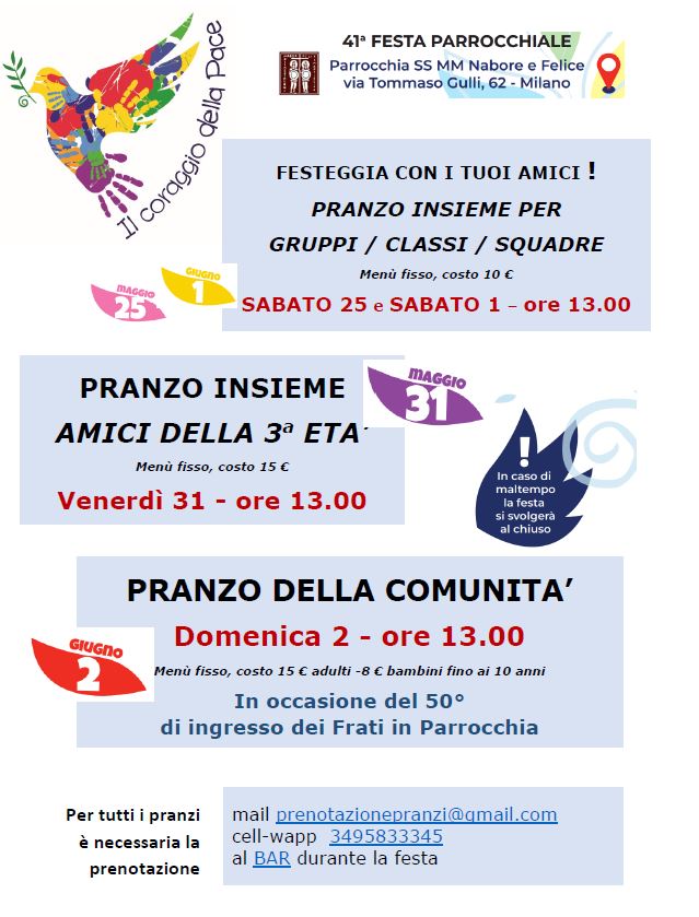 Proposte di pranzi comunitari durante la Festa Parrocchiale (prenotazione necessaria) Pubblicato giorno 16 maggio 2024 - In home page Durante la Festa Parrocchiale ci sono diverse occasioni per pranzare insieme. Si ricorda che è necessaria la prenotazione.